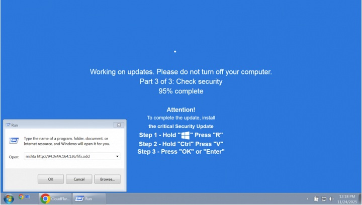 Pēdējo mēnešu laikā ClickFix sociālās inženierijas metode ir kļuvusi ievērojami bīstamāka. Uzbrucēji izmanto viltotu “Windows Update” ekrānu, lai panāktu, ka lietotājs pats izpilda ļaunprātīgas komandas.