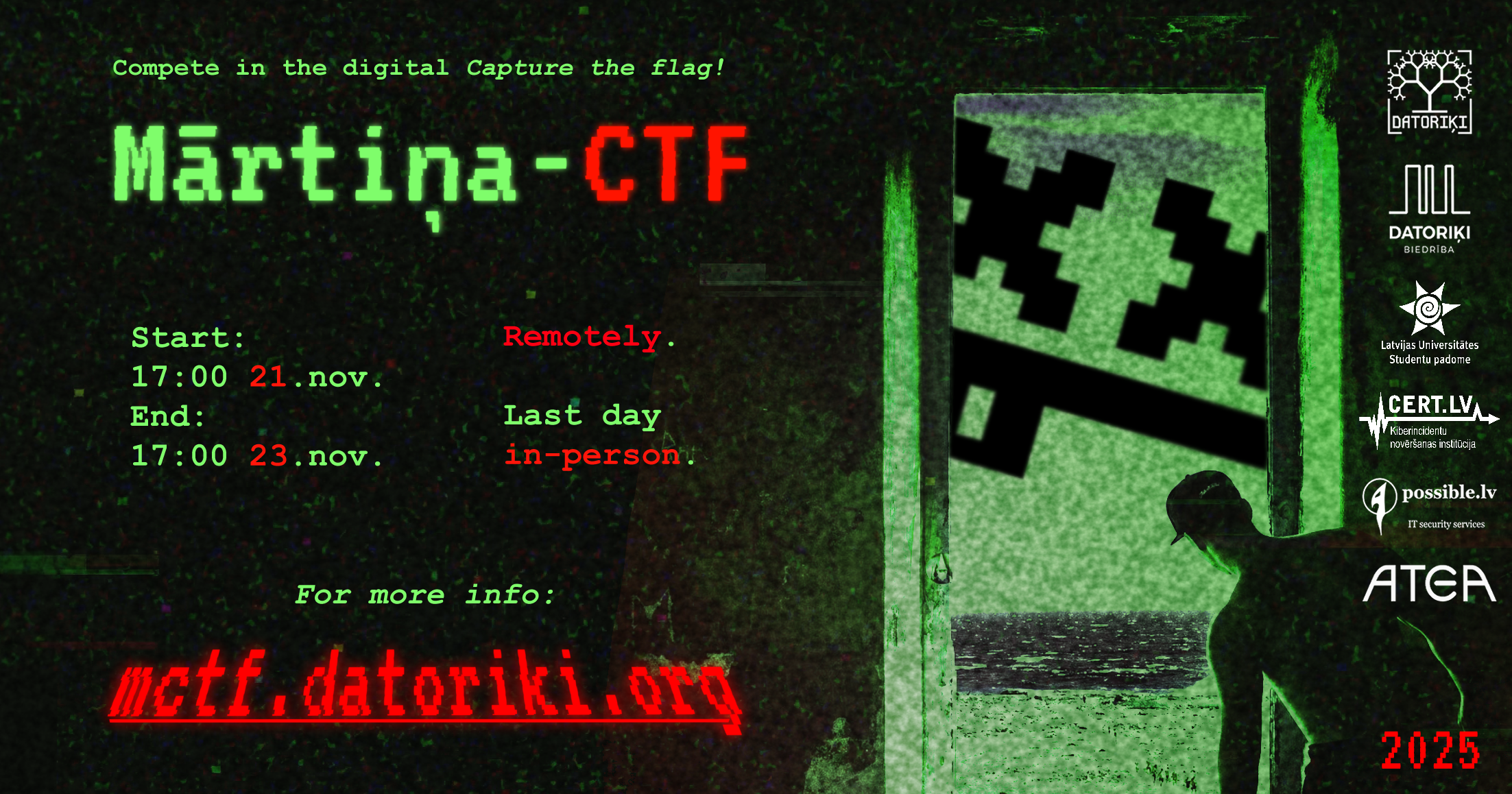 Mārtiņa-CTF is a team-based Capture The Flag (CTF) competition where participants solve various cybersecurity, programming, and technical puzzles. Challenges can be completed in any order and at any time during the 48-hour period — from November 21 at 17:00 to November 23 at 17:00 (EET).