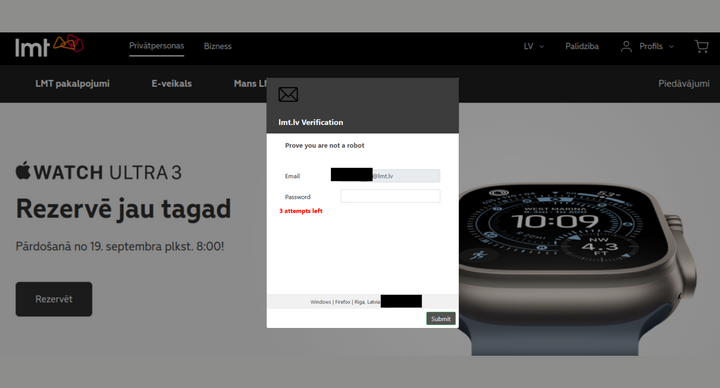 Jaunums! Fiksēta pikšķerēšana kontekstā ar 19. septembrī gaidāmo “Apple Watch Ultra 3” pārdošanu – krāpnieki, ļaunprātīgi izmantojot LMT vārdu, aicināja lietotājus “rezervēt jau tagad” ierīci krāpnieciskā verifikācijas lapā.