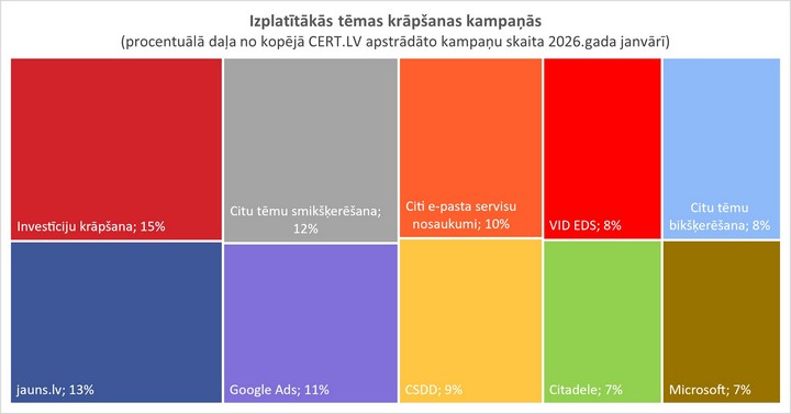 Gads iesācies ar pamatīgiem mīnusiem un apledojumiem. Visizplatītākais krāpšanas veids janvārī bija investīciju krāpšana, kas nemainīgi saglabājas kā viena no aktuālākajām krāpšanas formām. Ar nelielām izmaiņām uzbrukumu scenārijos seko ierastā smikšķerēšana (īsziņas), pikšķerēšana (e-pasti) un vikšķerēšana (telefonkrāpšana).